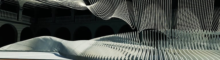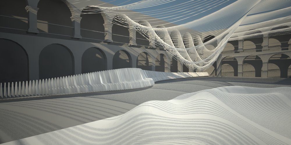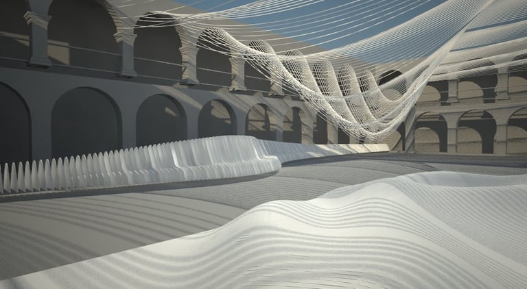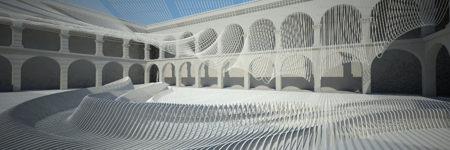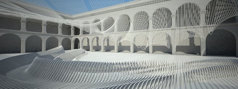 Our proposal for the design of a temporary installation at the Puertorrican Institute of Culture. This project showcases the use of digital fabrication methods to create intricate curves that undulate through the square courtyard of the historical building, providing a dynamic and unique experience for visitors through climbing, seating, and resting areas, as well as hanging ropes from the arches.